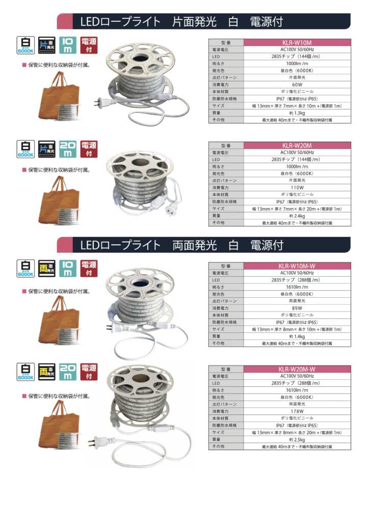 - 選べる「ラインナップ」 設置場所や用途に合わせて、「片面発光」と「両面発光」の2タイプから選べます。長さも10mと20mをご用意。さらに、持ち運びや保管に便利な専用収納袋付きです!