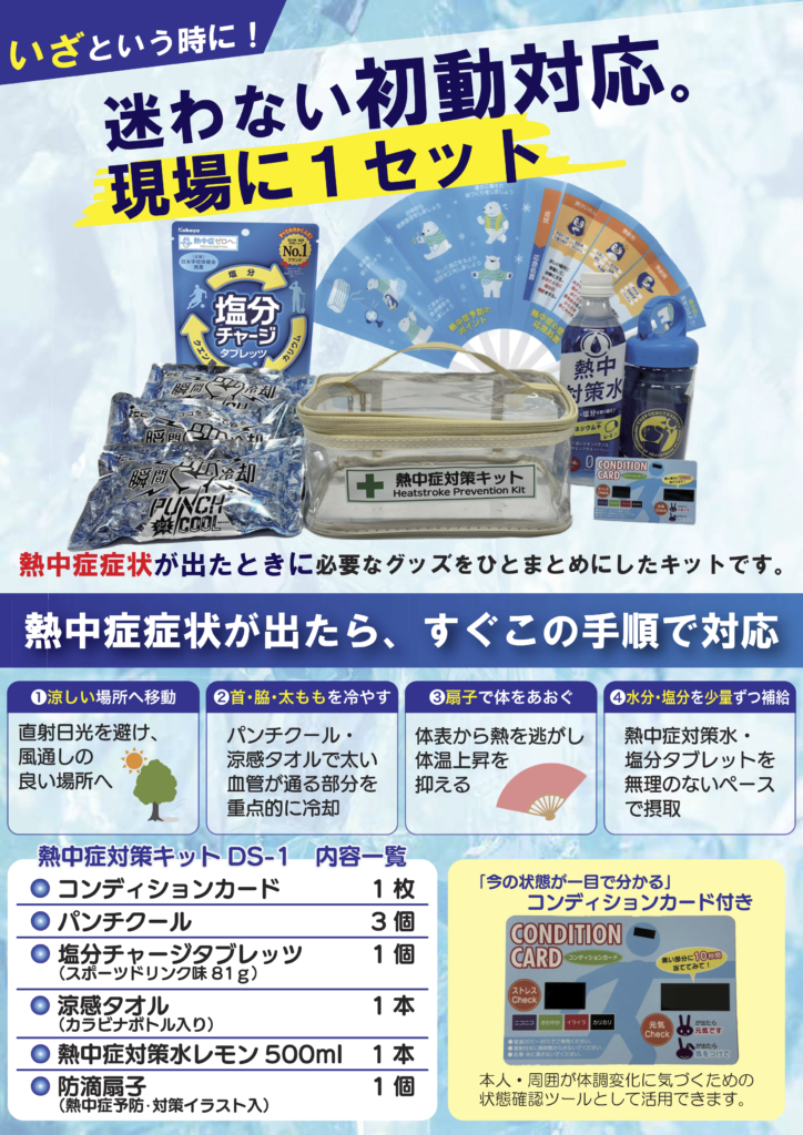 - 迷わない手順: キットには「涼しい場所へ移動」「冷却」「水分補給」といった具体的な対応手順が記されており、誰でも迅速に動けます。